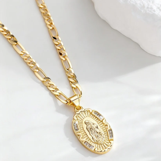 14K Gold Plated Guadalupe Virgin Mary Oval Zircon Inlay Pendant Necklace